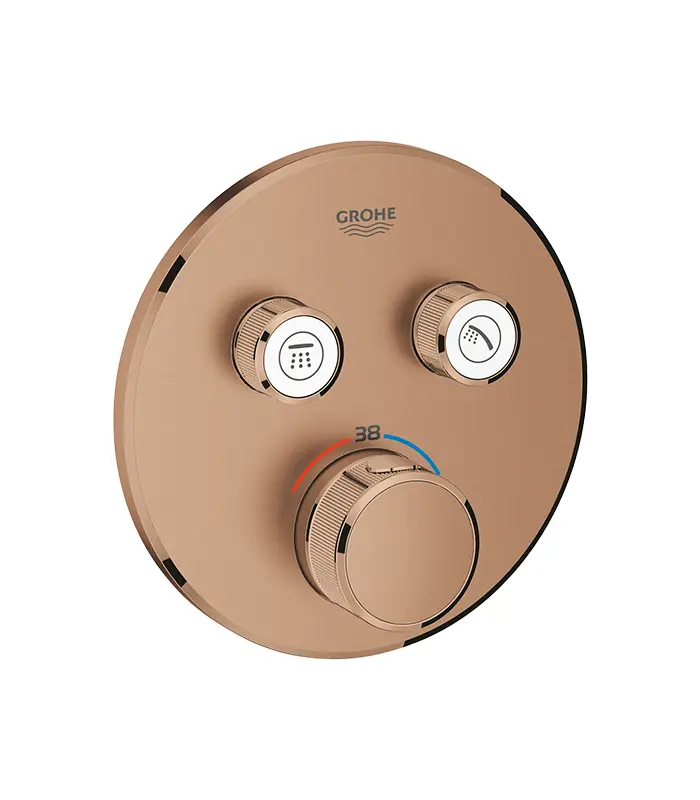 La façade mitigeur bain/douche encastré 29119DL0 de la marque GROHE se distingue par sa finition Warm Sunset brossé, une teinte élégante proche du cuivre/rose gold, idéale pour les salles de bain modernes et luxueuses.
